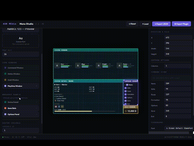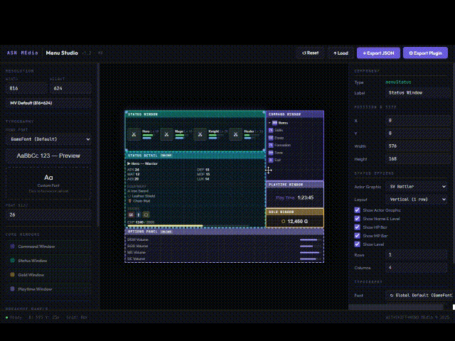 ASN's Menu Studio is a standalone browser-based editor where YOU design the menu. Open it in your browser (online or offline), drag your windows into place, see your layout in real time, configure every detail with point-and-click controls, and export a ready-to-use plugin file directly into your game project's plugins. No coordinates. No Common Events. No guesswork. No JavaScript.